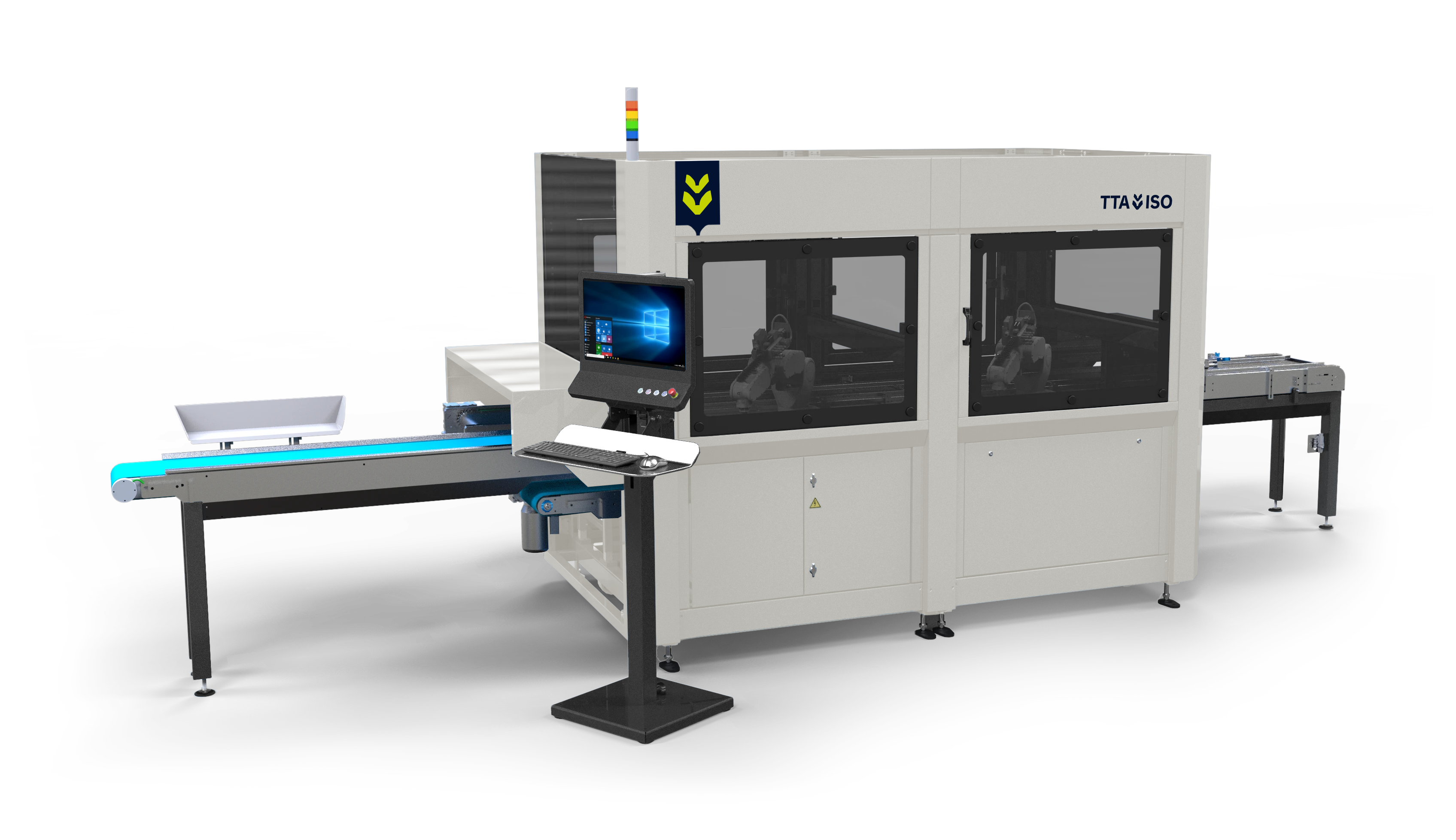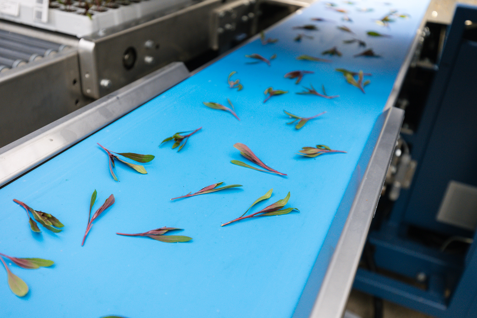 trays ejas de tapones se colocan en el transportador de cadena de alimentación, manual o automáticamente. A continuación, el transportador de cadena coloca las trays con precisión en su destino. Los recortes pueden separarse manualmente en el transportador de recogida o automáticamente con VisionAir, que utiliza tecnología de visión avanzada y chorros de aire para garantizar que sólo se entregan recortes perfectamente separados al CuttingEdge.