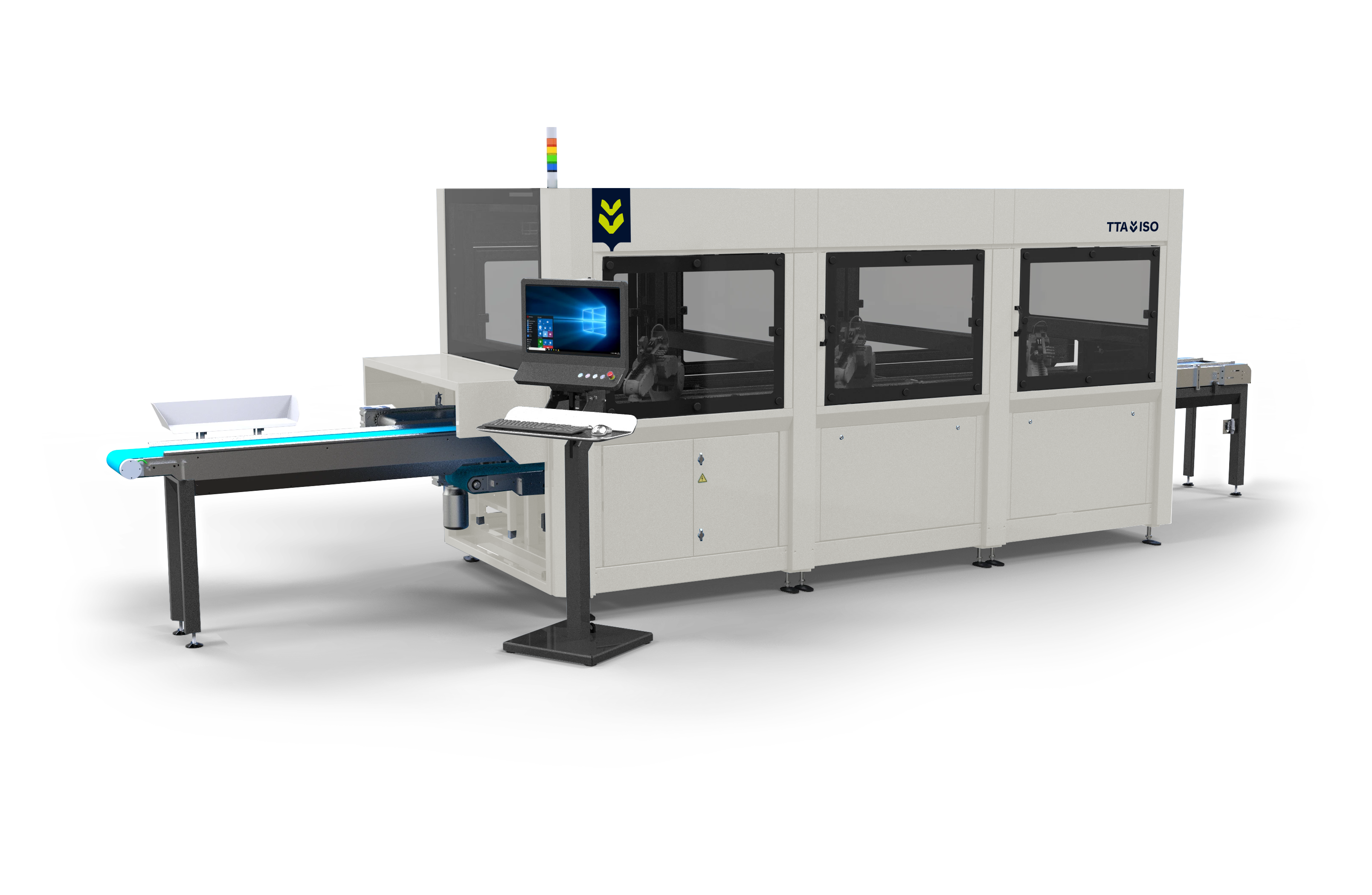 trays ejas de tapones se colocan en el transportador de cadena de alimentación, manual o automáticamente. A continuación, el transportador de cadena coloca las trays con precisión en su destino. Los recortes pueden separarse manualmente en el transportador de recogida o automáticamente con VisionAir, que utiliza tecnología de visión avanzada y chorros de aire para garantizar que sólo se entregan recortes perfectamente separados al CuttingEdge.