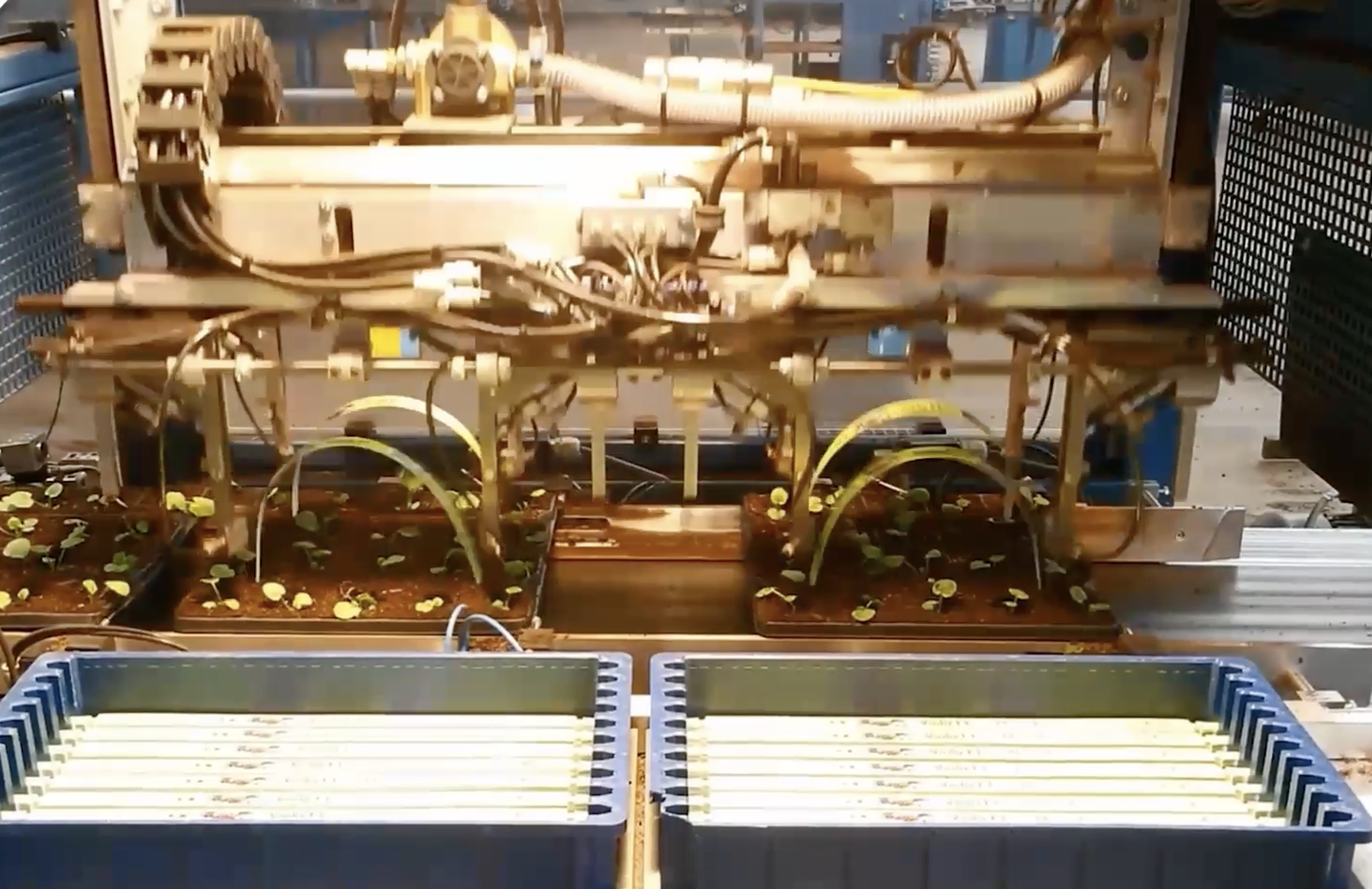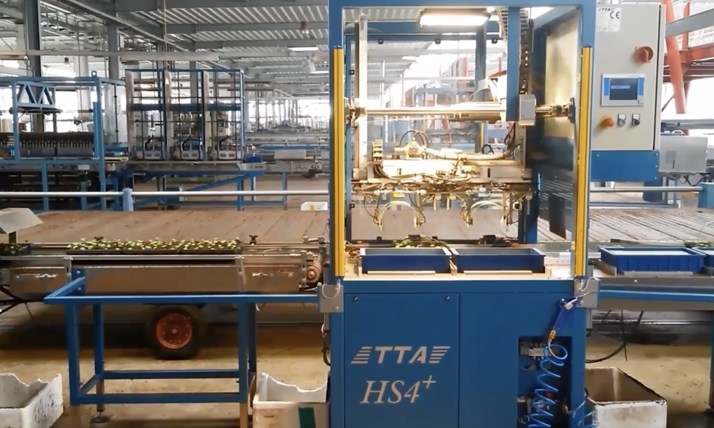 La HS4 es una máquina de aplicación automática de asas en packs plantas de cama. Dispone de una mesa deslizante en la que pueden colocarse cajas de almacenamiento con asas. Cuando las cajas con asas están vacías, la mesa se desliza automáticamente hacia el otro lado con cajas llenas para continuar y garantizar un tiempo de inactividad mínimo.