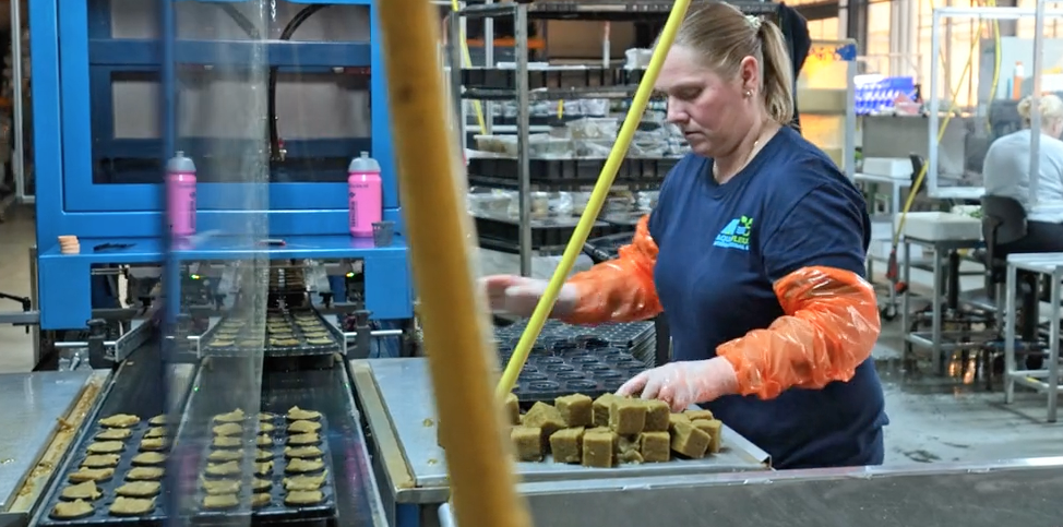 La Manual Sticking Line es un sistema de doble transportador con posiciones de parada para trays individuales y sus correspondientes posiciones de trabajo.