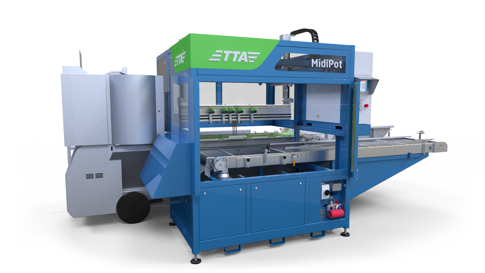 Con un sistema de transporte adicional, también se puede utilizar para trasplantar en trays, packs y trays lanzadera. La MidiPot ofrece una interfaz de usuario fácil de entender con autodiagnóstico integrado.
